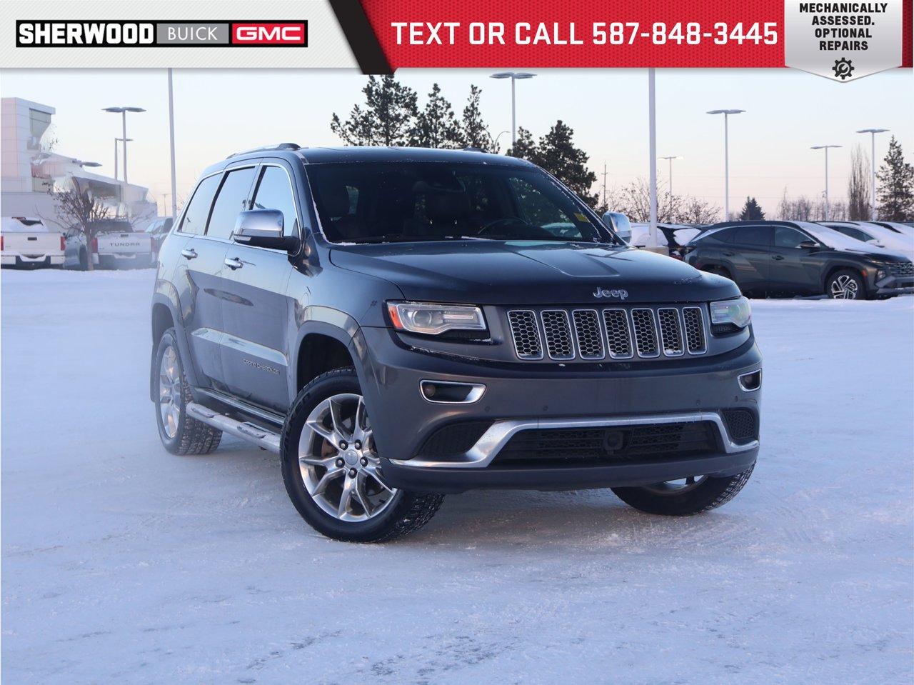 Sunroof | Navigation | Heated And Cooled Leather Seats | Heated Steering Wheel/Rear Seats | Dual Zone Climate Controls | Remote Start | Adaptive Cruise Control | Power Liftgate | 20 WheelsExperience premium capability and comfort with this distinguished 2014 Jeep Grand Cherokee Summit. Powered by a strong 5.7L V8 and equipped with 4-wheel drive, this Grand Cherokee delivers confident performance whether you're cruising city streets or tackling rugged terrain.This Summit model is loaded with luxury and convenience features, including an open-air sunroof and built-in navigation to guide your adventures with ease. Enjoy year-round comfort with heated and cooled leather seats, heated rear seats, and a heated steering wheel, while dual-zone climate control ensures personalized comfort for driver and front passenger.Start your day with ease using remote start, and stay relaxed on the highway with adaptive cruise control. The power liftgate adds effortless access to the spacious cargo area, and stylish 20 wheels complete the appearance.With its blend of rugged capability, upscale amenities, and advanced features, this 2014 Grand Cherokee Summit is the perfect choice for drivers who demand both comfort and performance.Talk to our award winning sales staff today and book an appointment or inquire about our services. Sherwood Buick GMC is incredibly proud to be serving Sherwood Park, Edmonton and surrounding areas. Treat yourself - stop by Sherwood Buick GMC today we're located at 10 Automall Road Sherwood Park, Alberta T8H 2N1.AMVIC Licensed Dealership*Pricing includes AMVIC, LEVY & Documentation fee. See dealer for details* This vehicle has received its Mechanical Fitness Assessment (MFA), however the required work to pass its MFA has not been completed. The Mechanical Fitness Assessment paperwork is available for viewing, and will be provided to the consumer prior to signing of the bill of sale. Please contact the dealer for more information.
