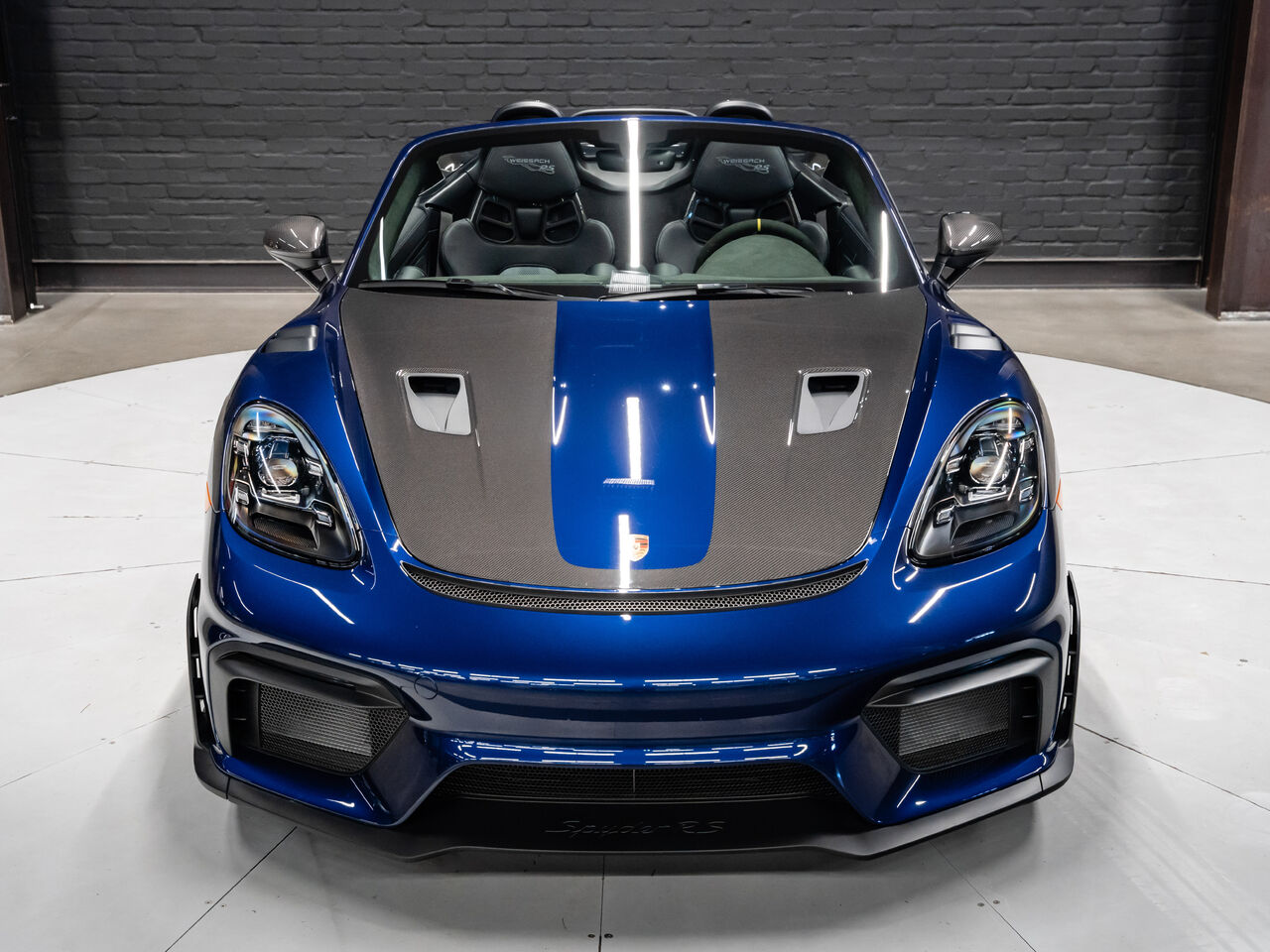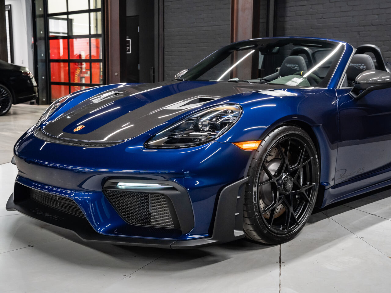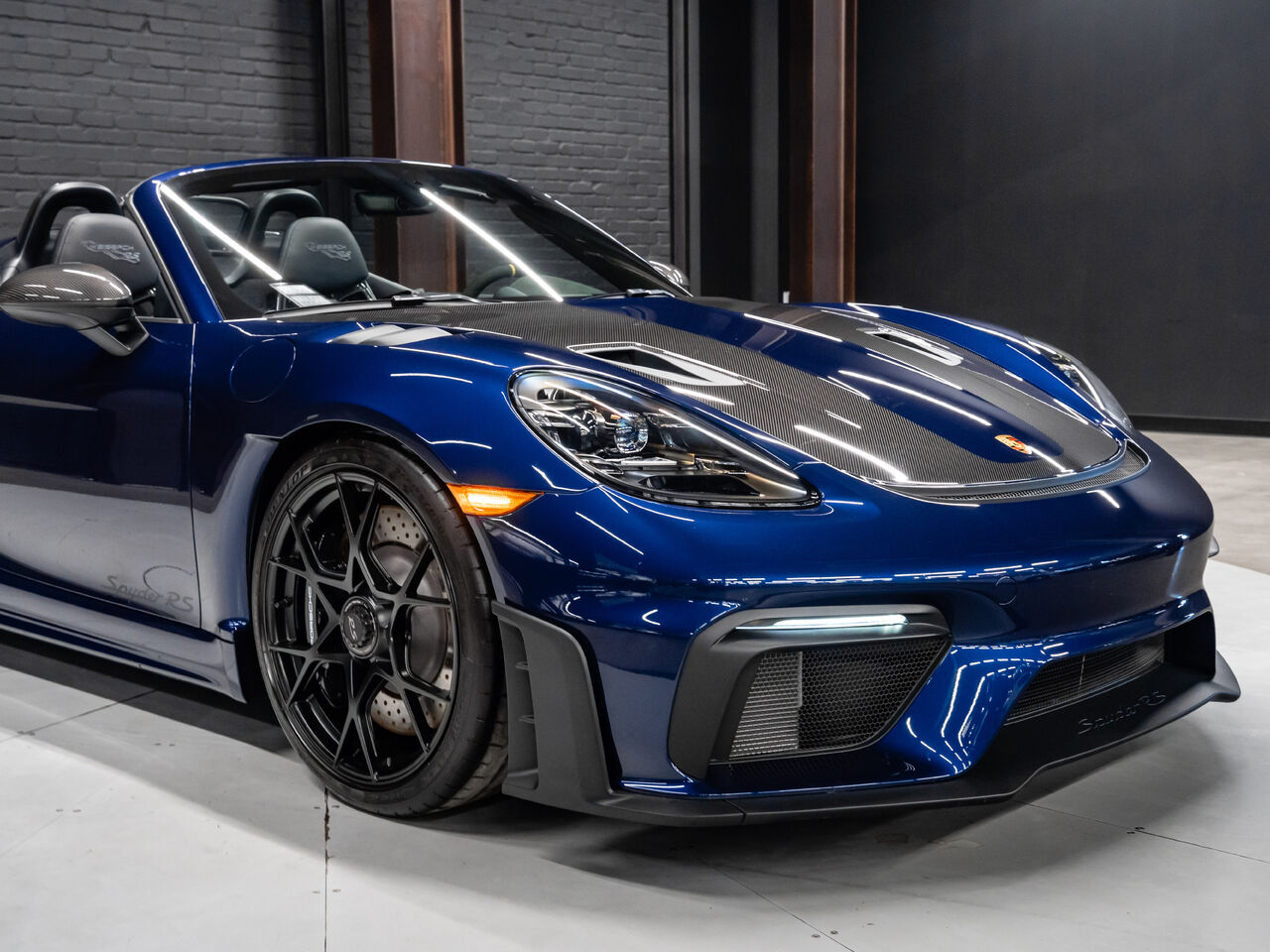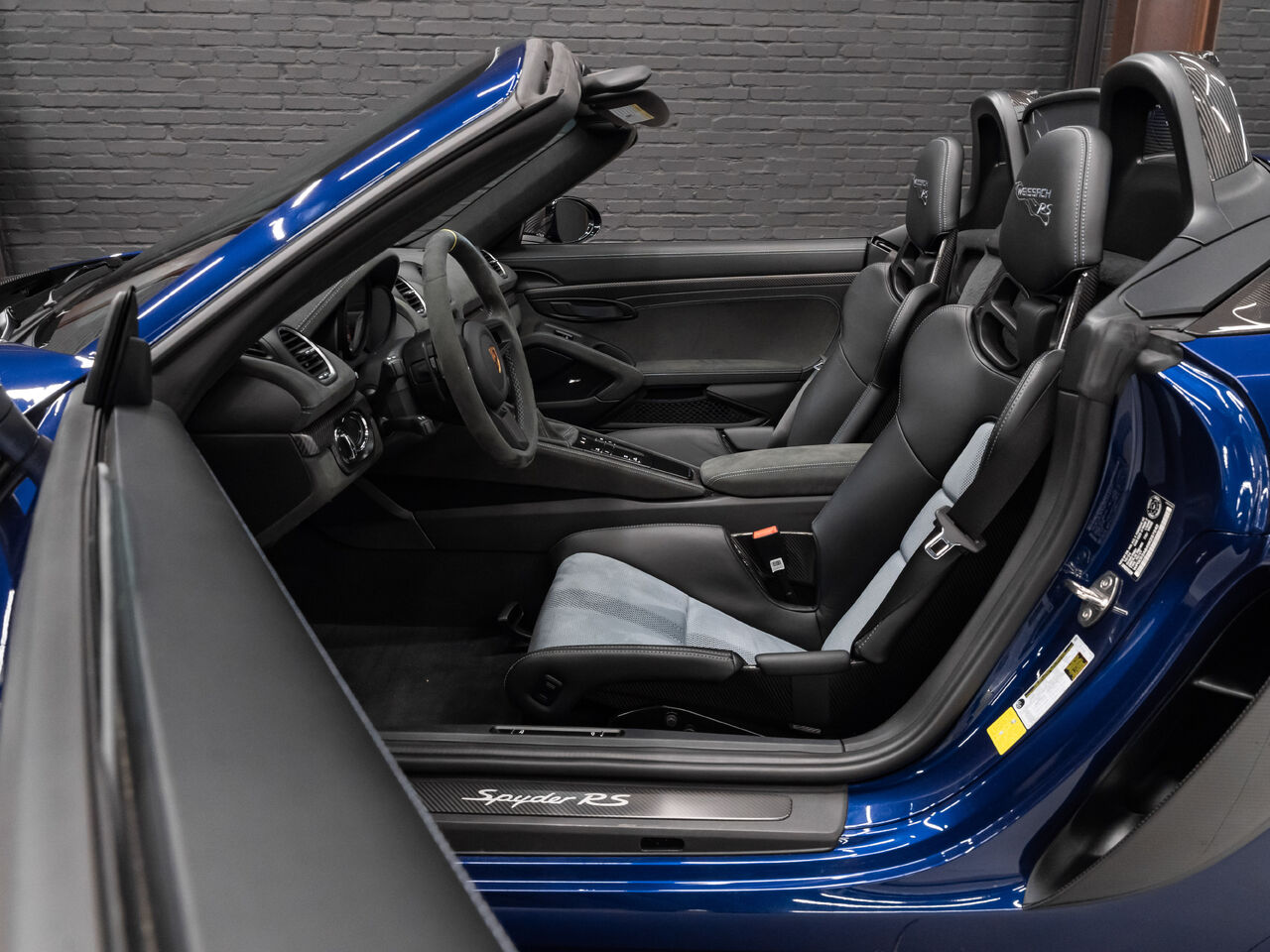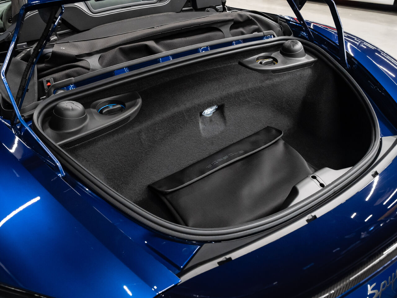 The 2025 Porsche 718 Spyder RS in striking Gentian Blue Metallic with a refined Black and Arctic Grey interior is a true masterpiece of performance and design. This one-owner, non-smoker vehicle comes in like-new condition with a clean Carfax, reflecting meticulous care and attention.